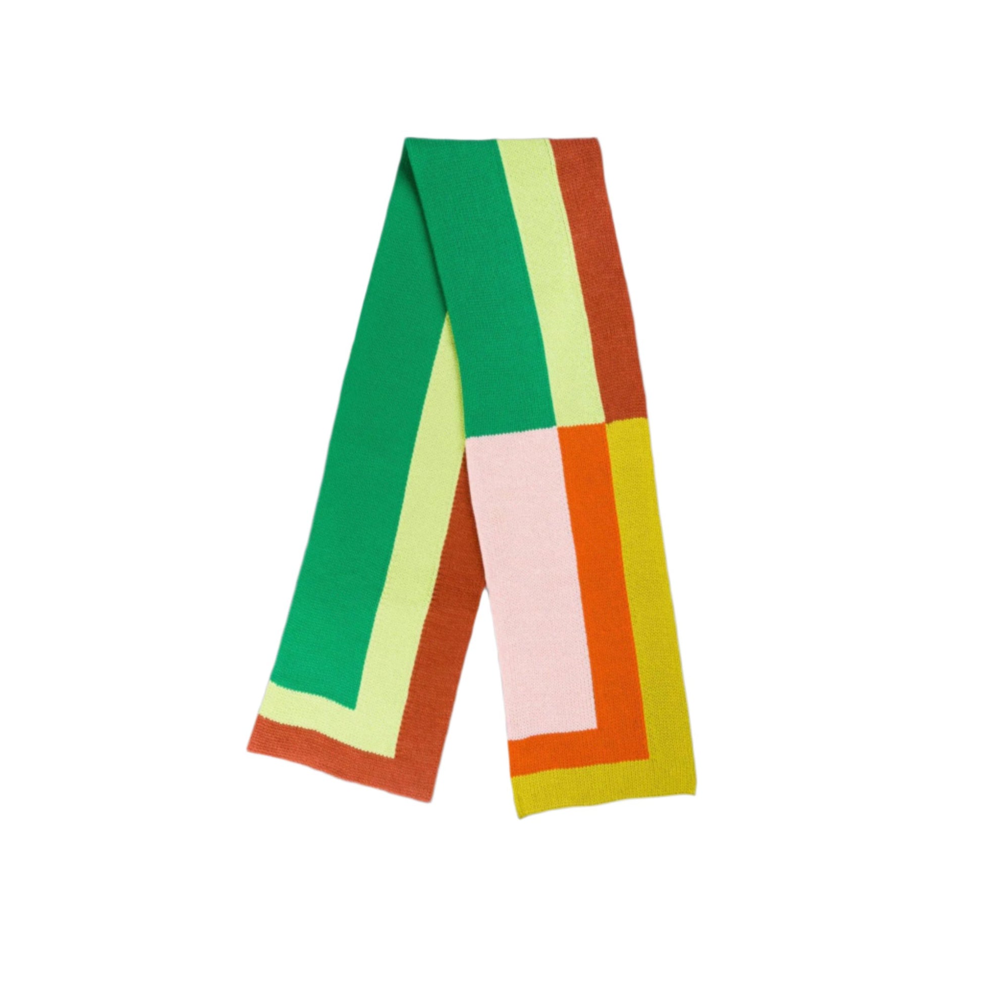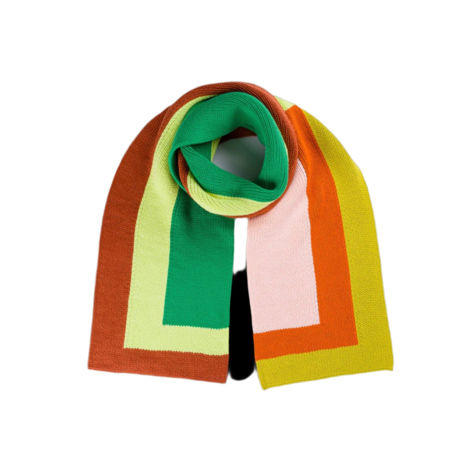 The color and pattern fits so perfectly on this comfy, cozy scarf you'll want to wear it all Fall and Winter. It has an oversized vibe made using jacquard knit. The modern angular colorblocking is timeless. Wear it long, or wrapped up for extra warmth. It's also fully reversible.